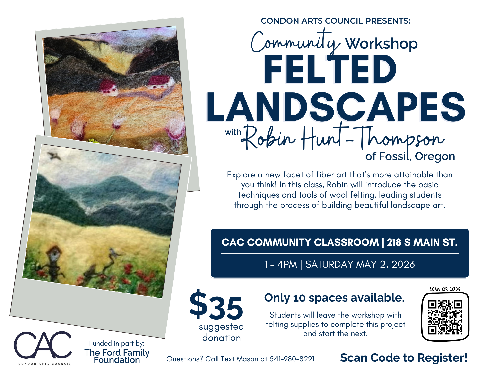 Explore a new facet of fiber art that’s more attainable than you think! In this class, Robin will introduce the basic techniques and tools of wool felting, leading students through the process of building beautiful landscape art.